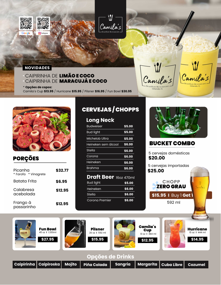 Whether you’re a Brazilian cuisine aficionado or a curious newcomer, Camila's Restaurant promises a dining experience that is both delicious and memorable. Each dish is a celebration of Brazilian culture, making it a must-visit destination on your culinary journey through Orlando. So be sure to stop by, indulge in a Caipirinha—especially the CAIPIRINHA DE LIMÃO E COCO priced at $13.95—and dive into the buffet for an unforgettable taste of Brazil!